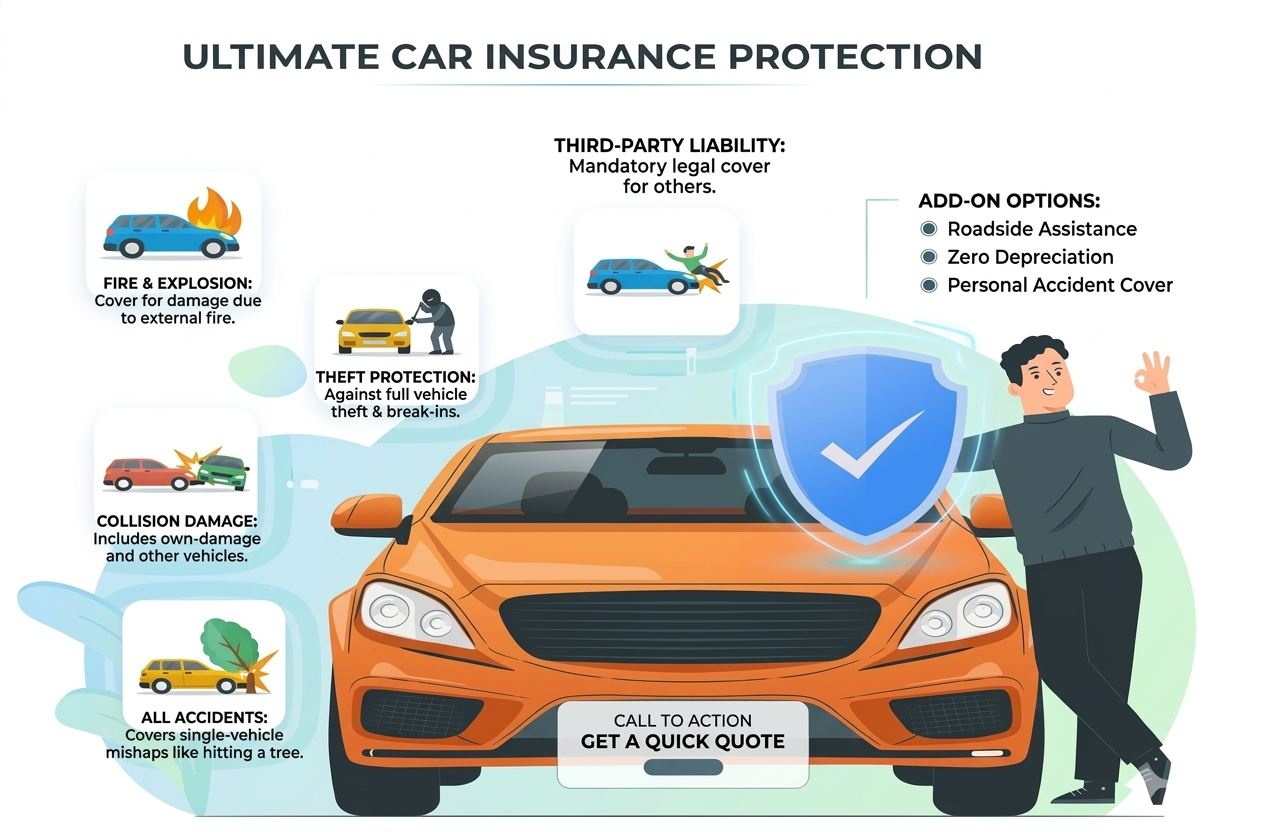 Car Insurance is an agreement between the vehicle owner and the insurance company. In this, you pay a premium, and the company provides financial protection against risks like accident damage, theft, fire, and third-party liability. It helps reduce financial loss and gives peace of mind.